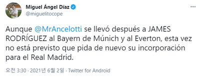 안첼로티는 바이언과 에버튼에 하메스의 영입을 요청했지만 이번 레알마드리드에서는 요청하지 않을 것으로 보입니다.