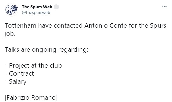 [Fabrizio Romano] 토트넘은 콘테와 클럽 프로젝트와 계약조건 및 금액에 관해 협의중