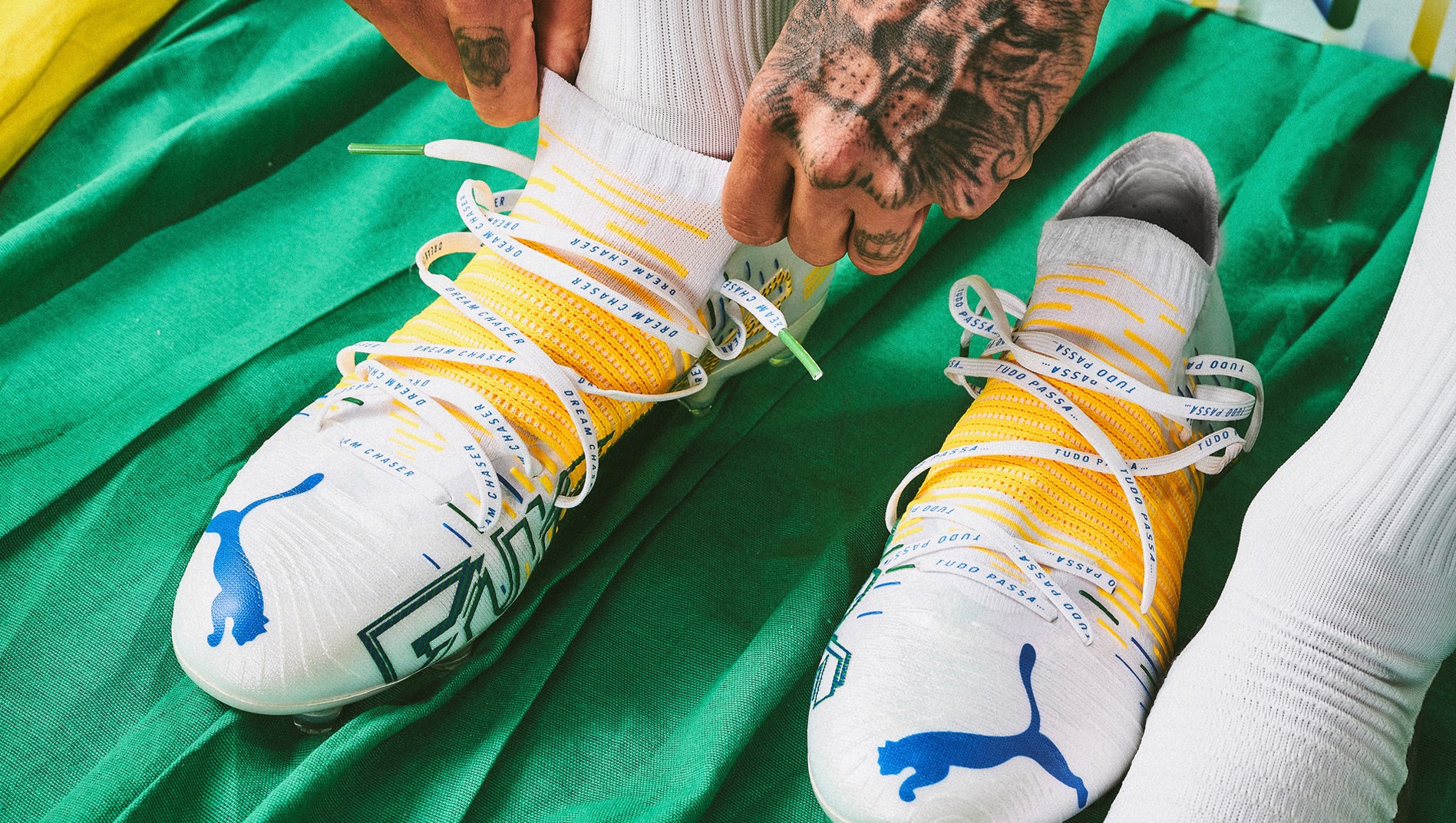 두 축구화의 신발 끈에는 네이마르에게 큰 의미를 지닌 두 문구가 새겨져 있습니다. 오른쪽 끈에는 ‘Dream Chaser’(꿈을 쫒는 자)가, 왼쪽 끈에는 'Tudo Passa’(모든 게 잘 될 거야) 입니다. Tudo Passa는 네이마르의 목에 새겨진 타투이기도 한데요. 푸마의 디테일함이 묻어나는 부분인 것 같습니다.