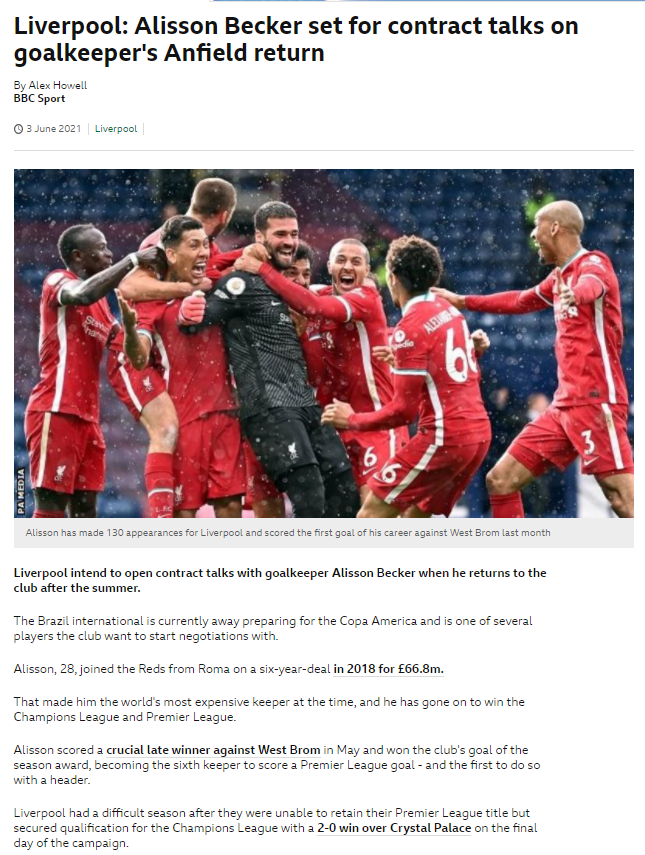 알리송은 현재 코파 아메리카 때문에 구단을 떠나있으며, 이번 여름 리버풀이 재계약하고자 하는 몇 명의 선수들 중 하나다.