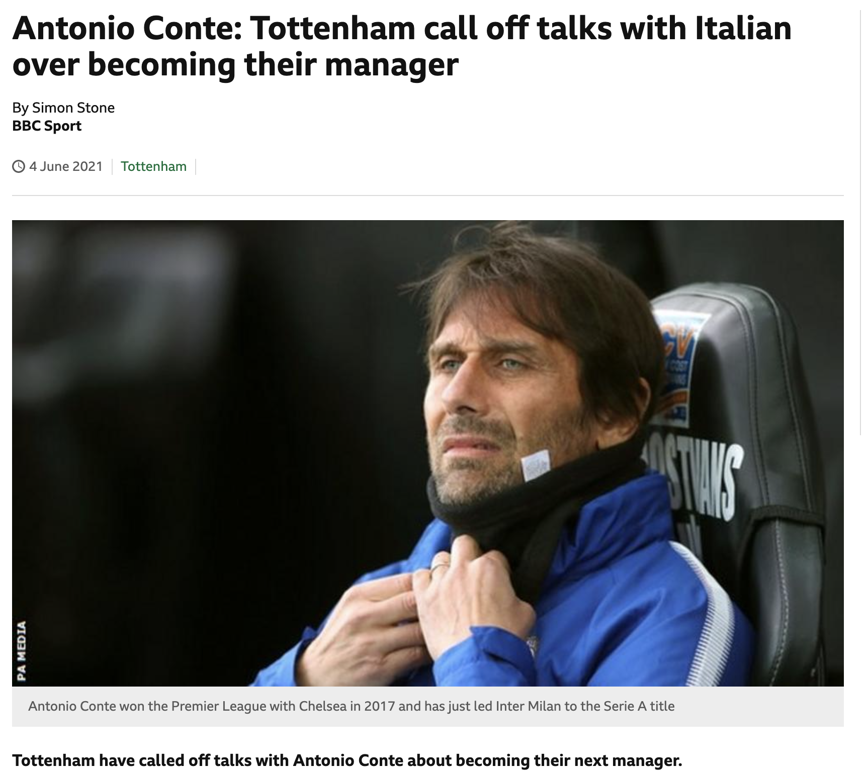 [[BBC] 토트넘 - 콘테 협상 중단]