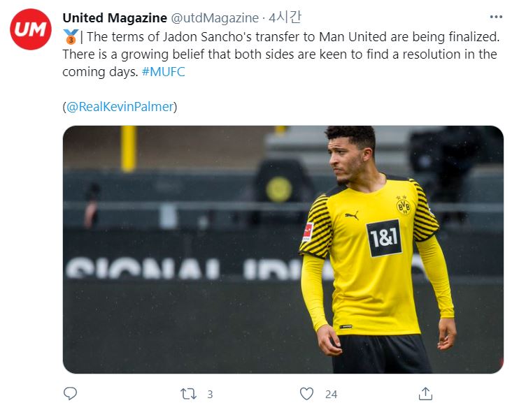 "제이든 산초의 맨유 이적 조건이 막바지에 접어들었다. 양측은 빠르게 합의접을 찾을거라는 믿음이 커지고 있다."