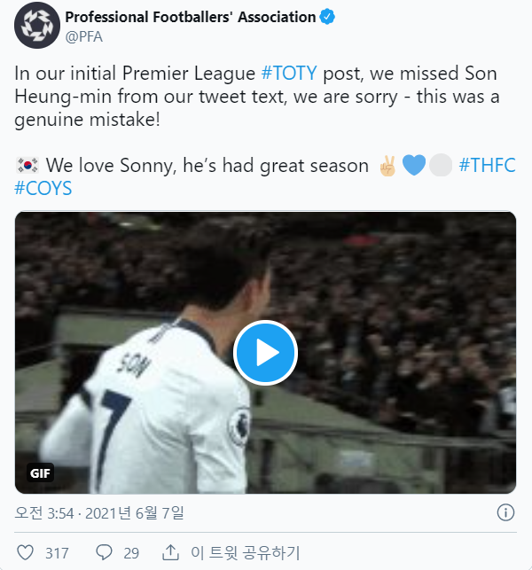 "최근 우리는 트위터 게시글에서 손흥민이 누락되었습니다. 죄송합니다. 이것은 정말 실수였습니다!"