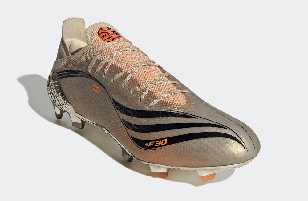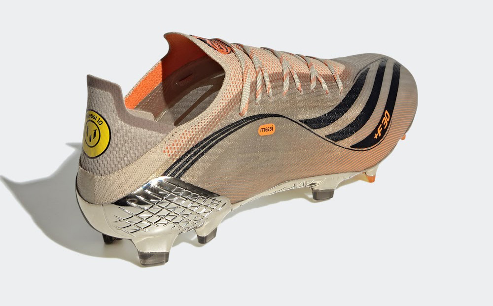 축구화의 디자인은 메시의 첫 번째 축구화인 2006년 ‘F30 Tunit’을 모티브로 삼았습니다. 당시 메시는 최상급이 아닌 F30 제품을 신은 것으로 유명합니다. 텅 부분에는 ‘팀가이스트(Teamgeist) 로고’까지 재현한 모습이네요.
