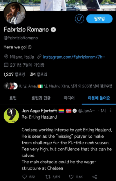 그리고 Jan Aage Fjortoft의 트윗을 좋아요를 누른 파브리지오 로마노ㄷㄷㄷㄷ
