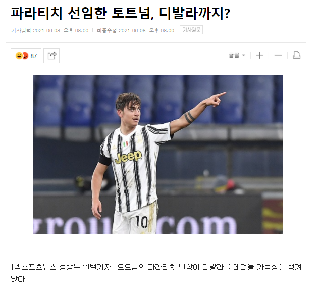 영국 익스프레스는 "토트넘이 파라티치 단장을 선임하면서 유벤투스의 파울로 디발라 영입 가능성이 커졌다"라고 보도했다.