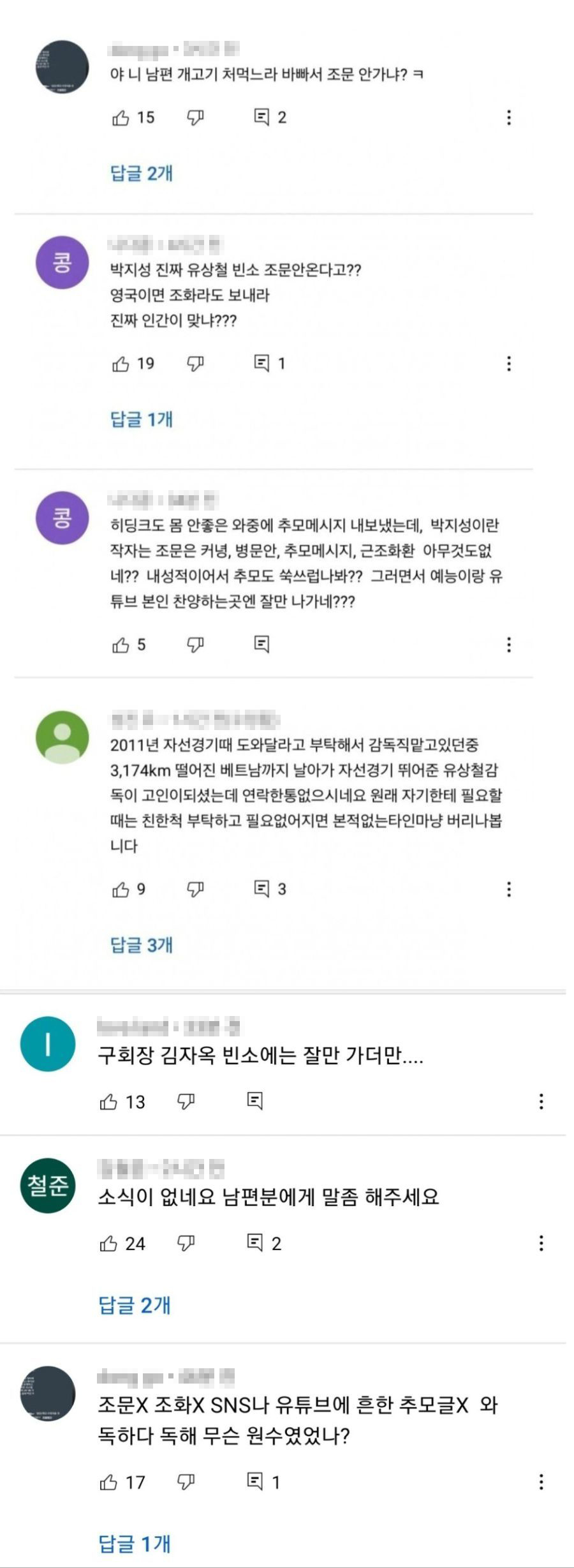 (아래는 박지성 부인 유튜브에 달린 악플들.. 이 상황에 이런 게 논란되는 게 참 슬프네요)