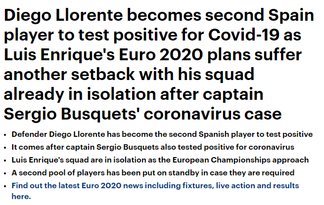 기사 원문 : https://www.dailymail.co.uk/sport/football/article-9666249/Diego-Llorente-second-Spain-player-test-positive-Covid-19.html
