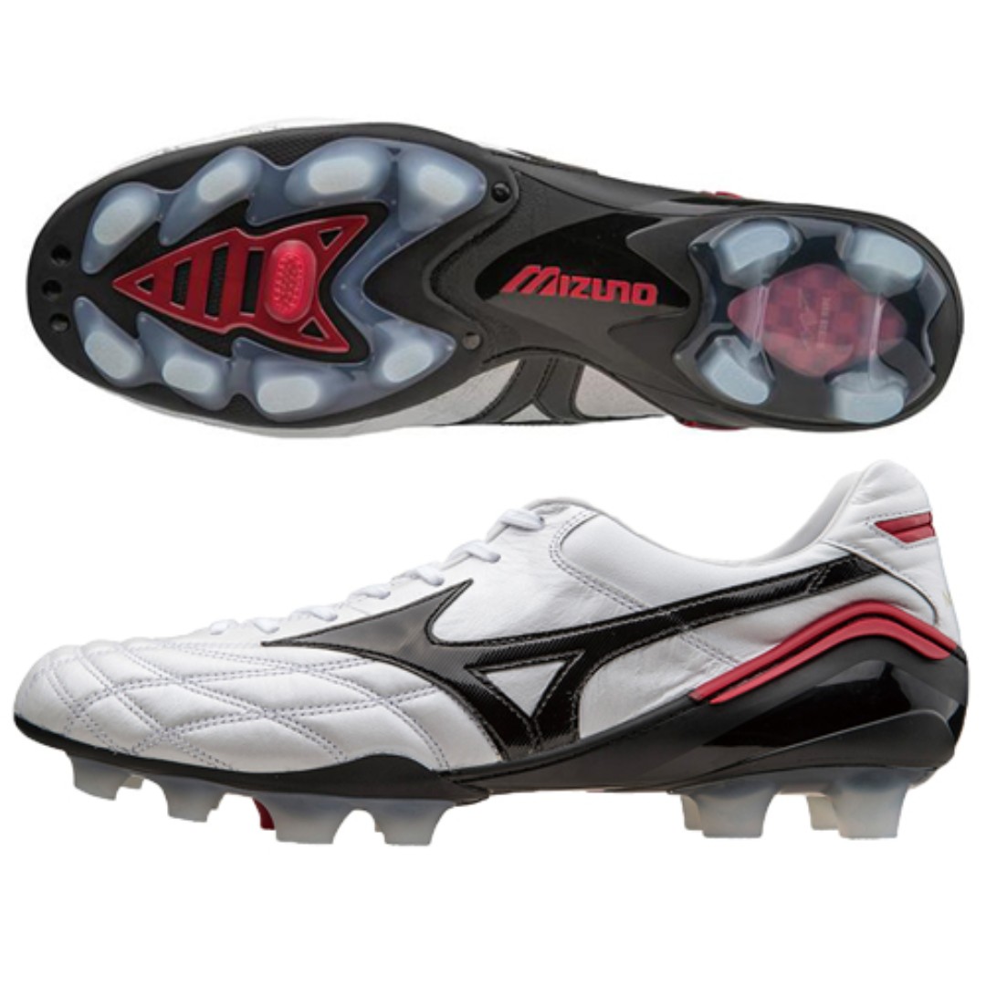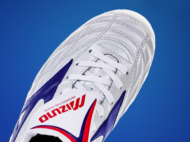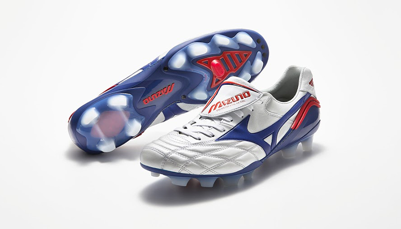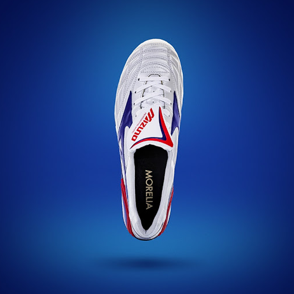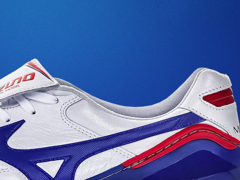 미즈노의 모렐리아 웨이브 '리빌드'는 전체적으로 흰색 캥거루 가죽을 사용했고 파란색은 솔플레이트와 양옆 로고에 사용되었고 빨간색은 포인트 부분에 살짝 들어가면서 세련되고 깔끔한 느낌을 줍니다.