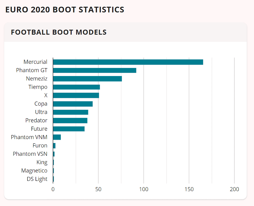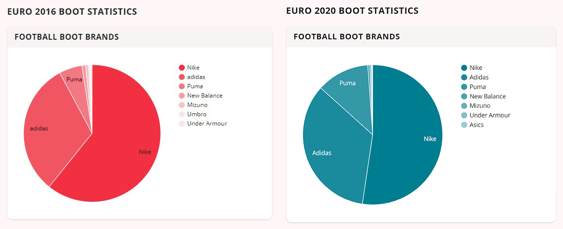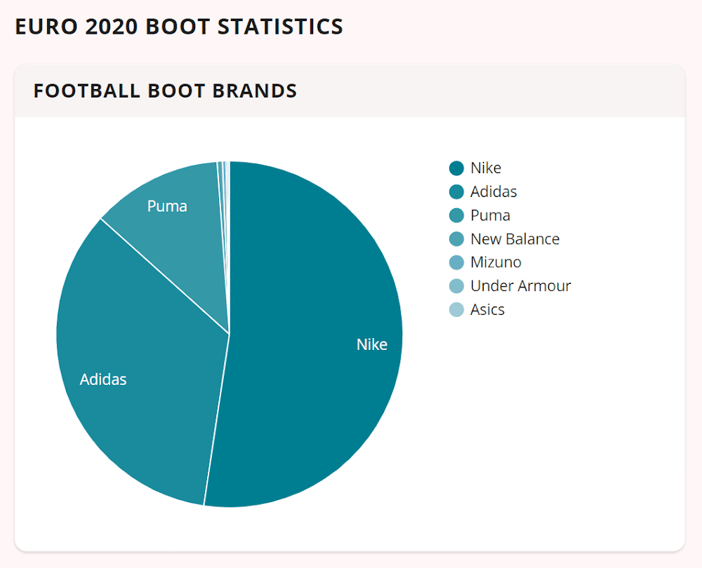 이전 토너먼트에서와 마찬가지로 나이키, 아디다스 및 푸마 세 브랜드가 가장 높은 비율을 차지했습니다. UEFA 유로 2020에서 나이키는 52.4%로 선수의 절반 이상을 위해 축구화를 만듭니다. 아디다스는 약 3분의 1인 34.4%로 2위, 푸마는 12.4%로 3위를 차지했습니다.