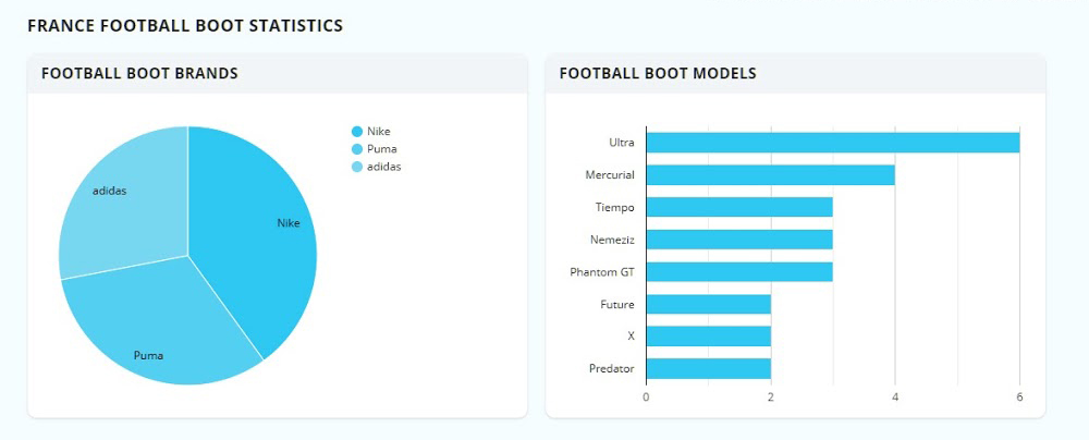 푸마는 프랑스 대표팀 중 8명의 선수가 계약을 맺었습니다. 물론 아직 나이키가 10명의 선수로 우위를 보입니다. 그러나 이전 2018 월드컵에서는 고작 2명의 선수가 푸마를 신고 있었던 걸 보면 푸마의 높은 상승률을 볼 수 있습니다.