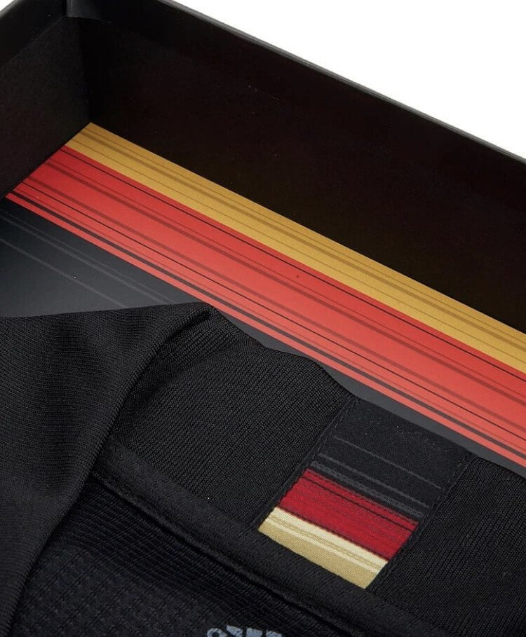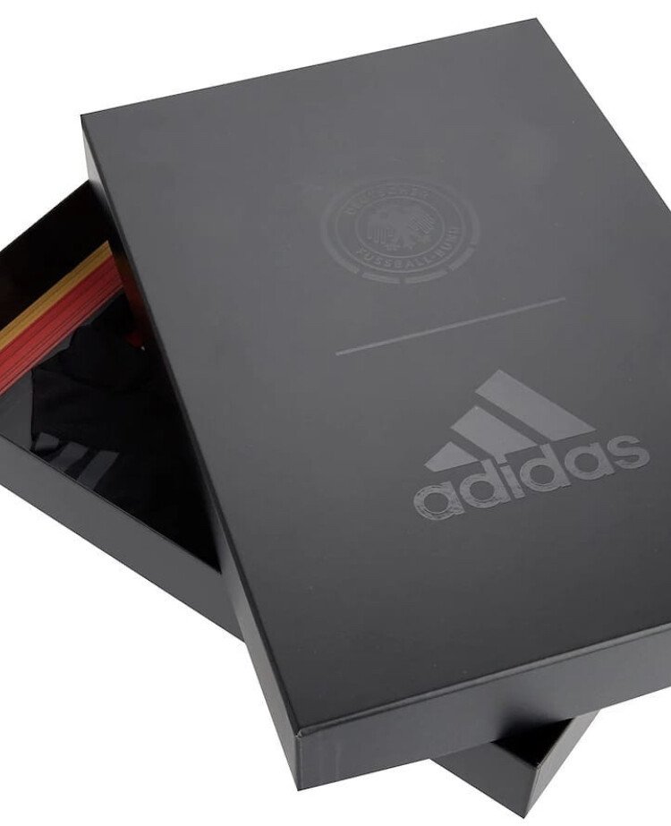 유니폼은 독일 축구 연맹을 뜻하는 Deutscher Fußball-Bund(이하 DFB)의 엠블럼과 아디다스 로고가 새겨진 검은색 상자 안에 들어가 있으며 상자의 안쪽 상단에도 독일 국기를 나타내는 검정, 빨강, 노랑이 들어가 있습니다.