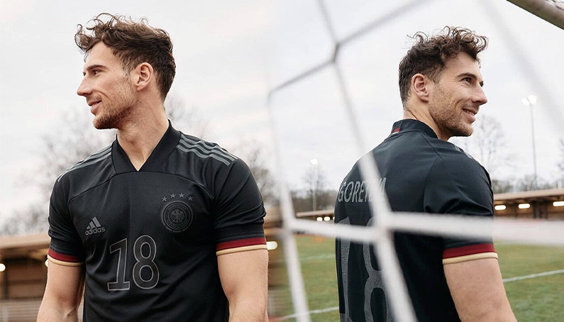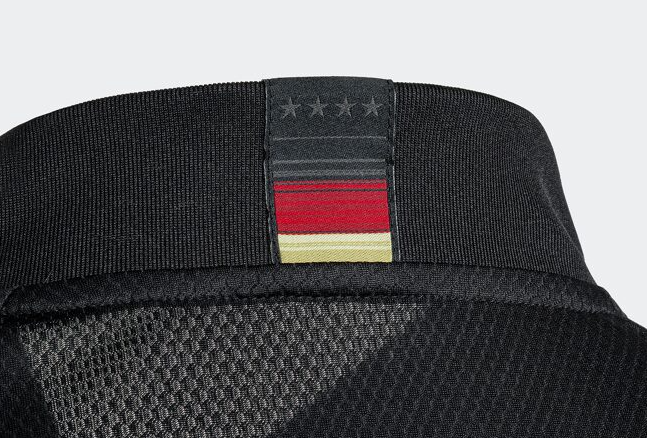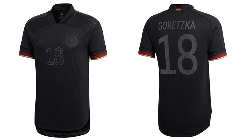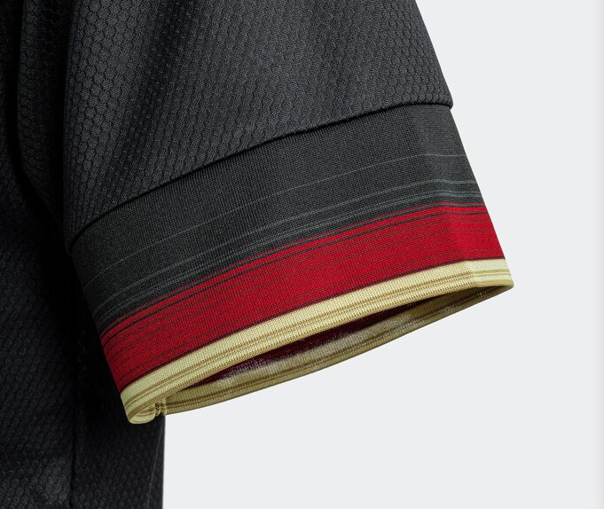 유니폼은 전체적으로 검은색으로 디자인 됐으며 숫자와 로고 엠블럼 또한 검은색으로 통일됐다는 것이 가장 큰 특징입니다. 팔의 끝 부분과 목의 카라 부분 안쪽과 뒷쪽 일부분에 독일 국기 색을 포인트로 넣어 유니폼 보다는 캐주얼한 반팔티 느낌을 줍니다. 유니폼 아래에는 AEROREADY가 적혀 있는데요, 이는 수분을 빠르게 흡수하여 땀이 나도 시원하고 축축하지 않도록 해주는 특징을 가진 아디다스의 섬유 소재라고 합니다.