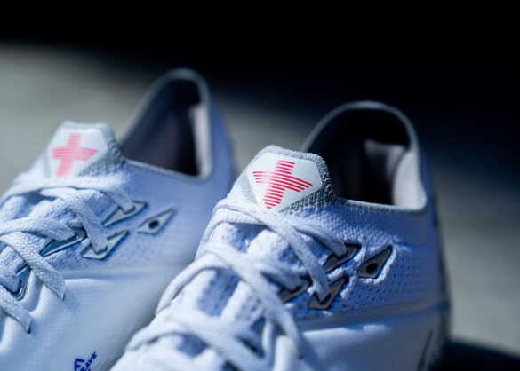 새로운 RS Alpha Flair 팩의 '퓨론 6+' 축구화는 흰색 / 파란색 / 빨간색 색상으로 잉글랜드 홈 유니폼과 일치합니다.