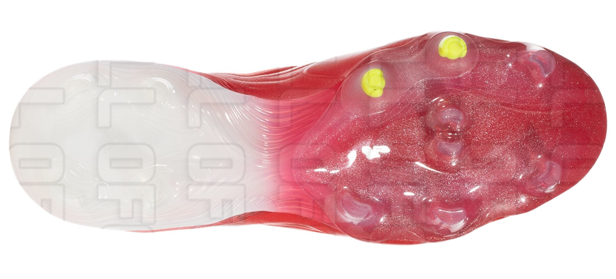 코파센스+의 아웃솔은 '센스프레임'이라고 불립니다. TPU 소재로 만들어진 센스프레임은 흰색에서부터 붉은색으로 그라데이션이 적용되었습니다. 또한, 인사이드, 엄지 발가락 쪽에 위치한 두개의 스터드는 '소프트 스터드'로 형광색이 사용되었는데요. 부드러운 소재를 주입해 공과 입팩트 되는 순간 구부러지는 효과가 있습니다.