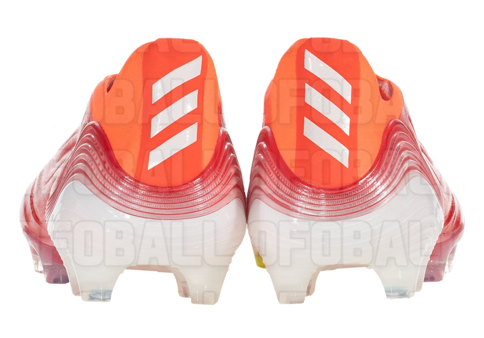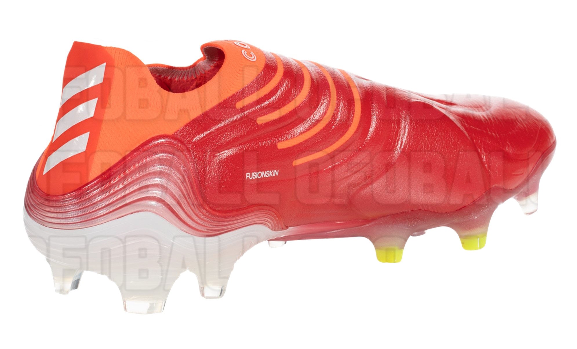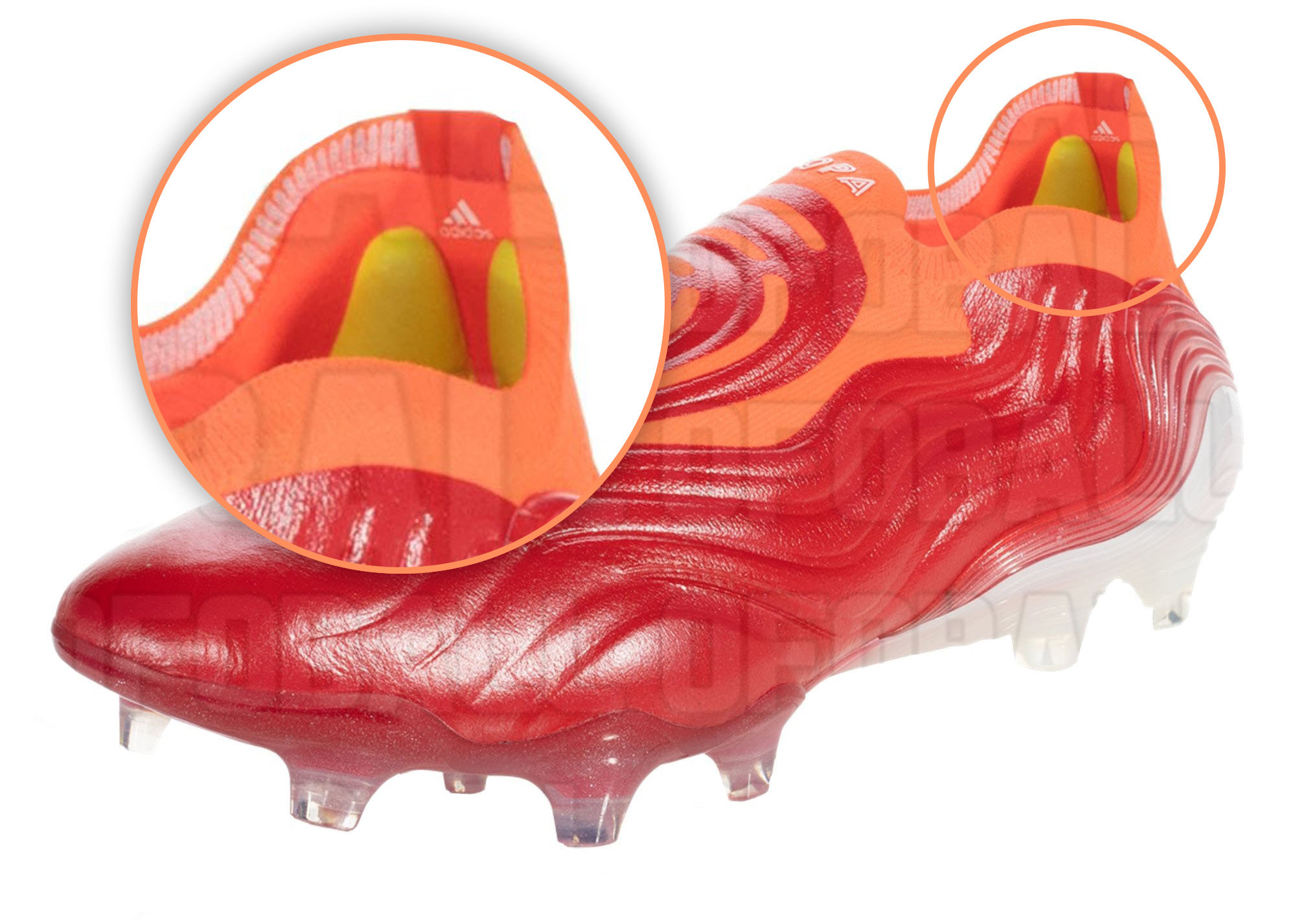 코파센스는 프라임니트와 천연 캥거루 가죽이 재봉선 없이 연결된 '퓨전스킨'이 사용되었습니다. 이는 수분 흡수율을 낮추고 유연성이 향상되었는데요. 이번 축구화의 천연 가죽 부분은 빨간색, 프라임니트 부분은 밝은 주황색이 사용되었습니다. 뒷꿈치 부분에 아디다스 삼선로고는 흰색으로 배치되었네요.