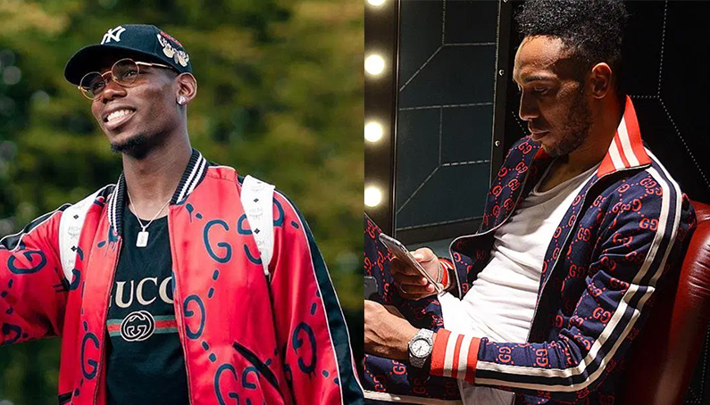 (구찌의 로고패턴 디자인 자켓을 입은 축구선수들 포그바(왼), 오바메양(오))