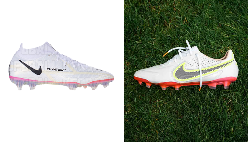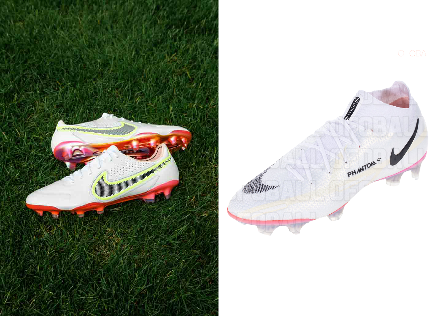 두 축구화의 색상은 흰색, 형광빛의 노란색, 분홍색이 사용돼 산뜻하고 경쾌한 느낌을 주는데요, 아웃솔은 빛에 반짝이는 모습이 2018년 러시아 월드컵 팩에 사용했던 크롬아웃솔이 적용된 모습으로 전체적인 색상과 잘 어울리는 느낌입니다.