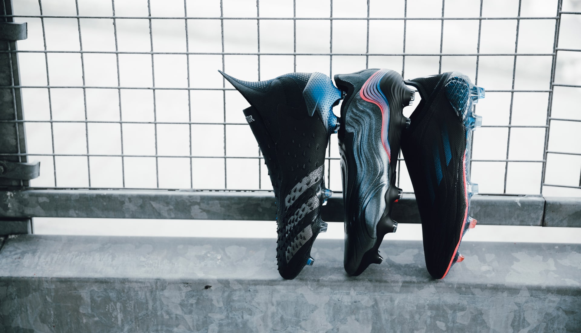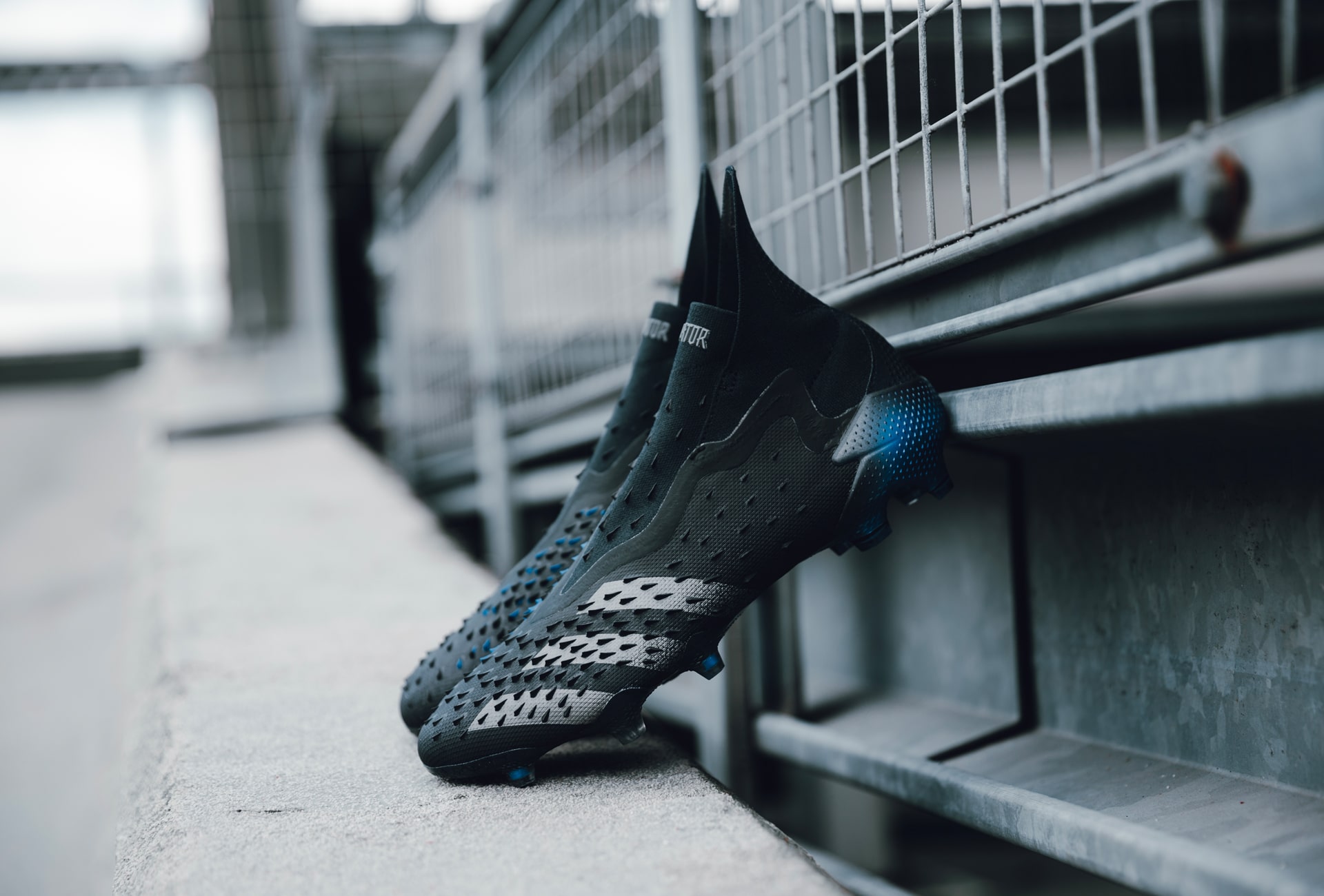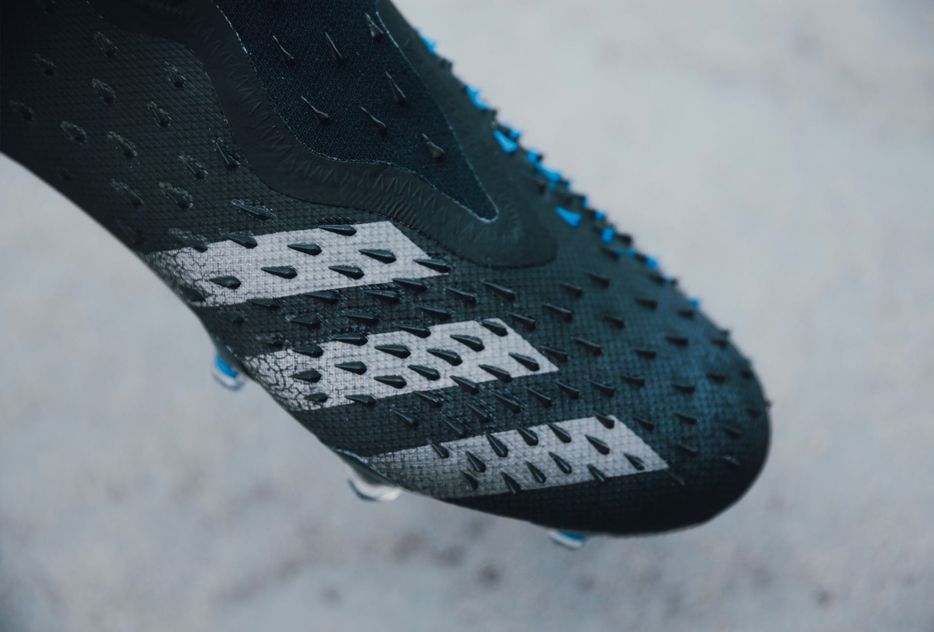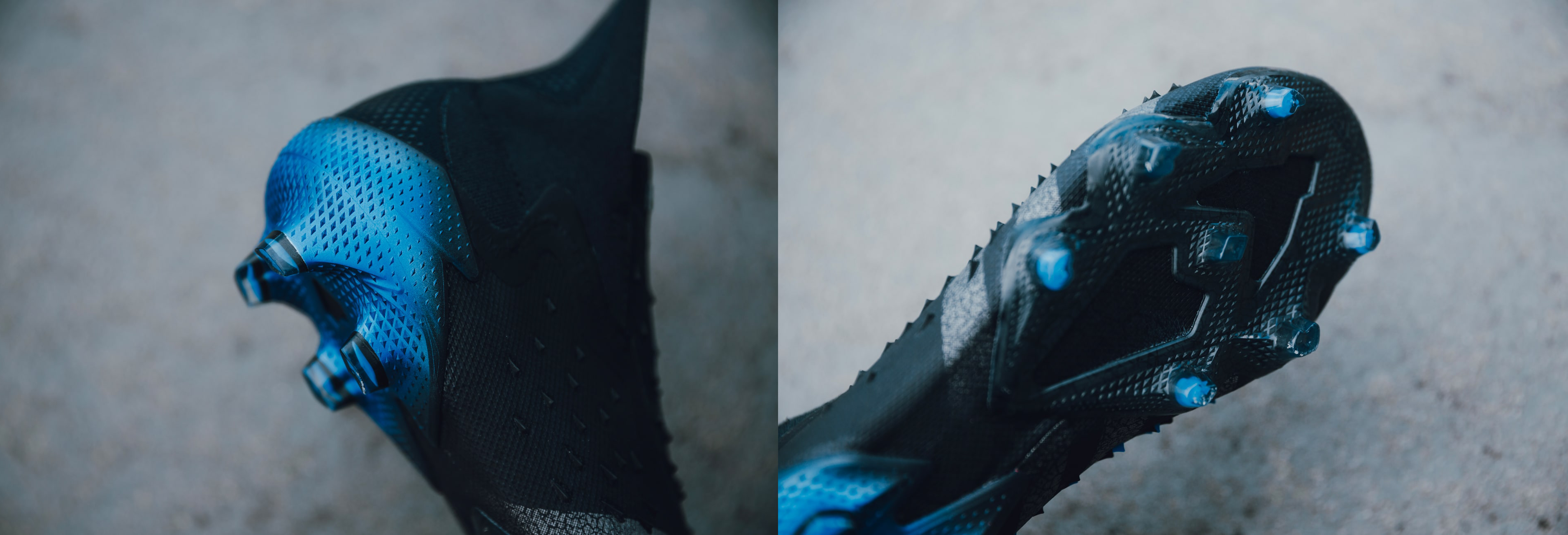 마지막으로 프레데터 프릭은 "Core Black/Iron Metallic/Sonic Ink" 색상을 사용했는데요. 푸른 계열의 색상이 토박스 부분, 데몬스킨 스파이크, 스터드 그리고 힐컵에 사용되어 부드러우면서도 시크한 멋이 느껴지는 것 같습니다. 발 앞부분의 아디다스를 상징하는 삼선은 밝은 회색을 사용했네요.
