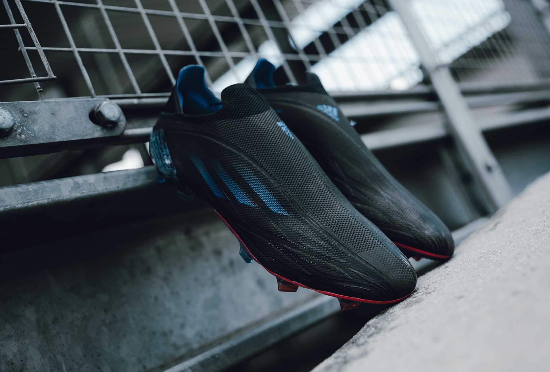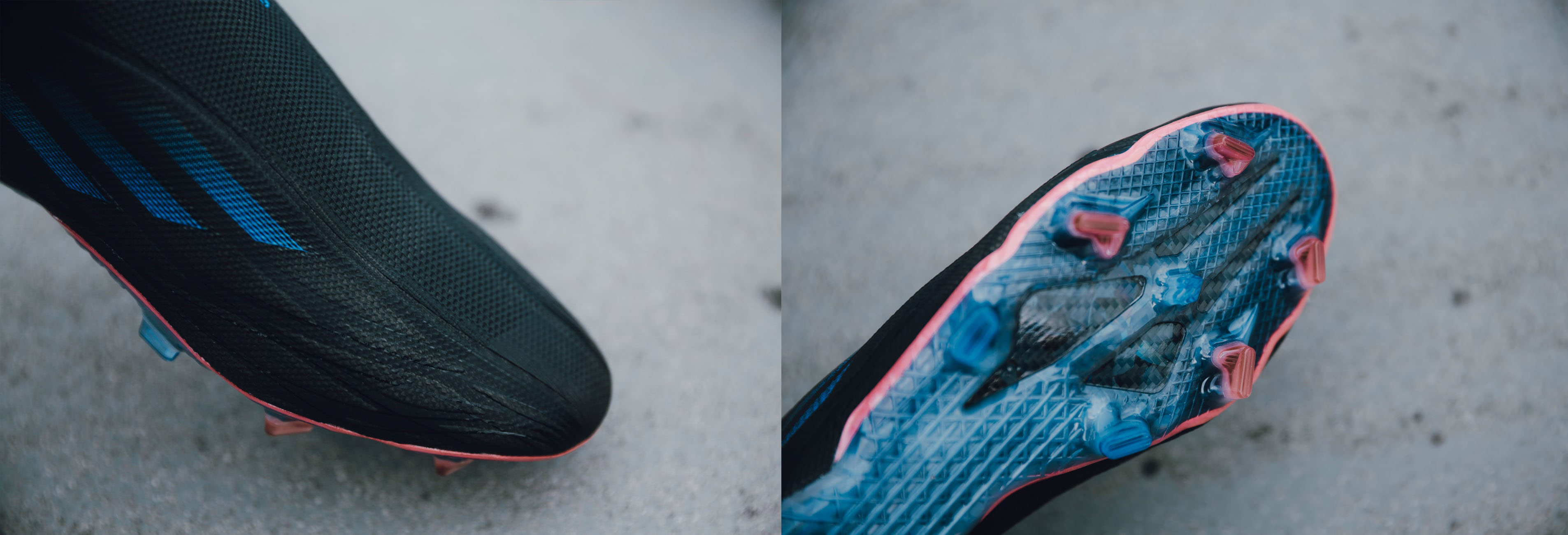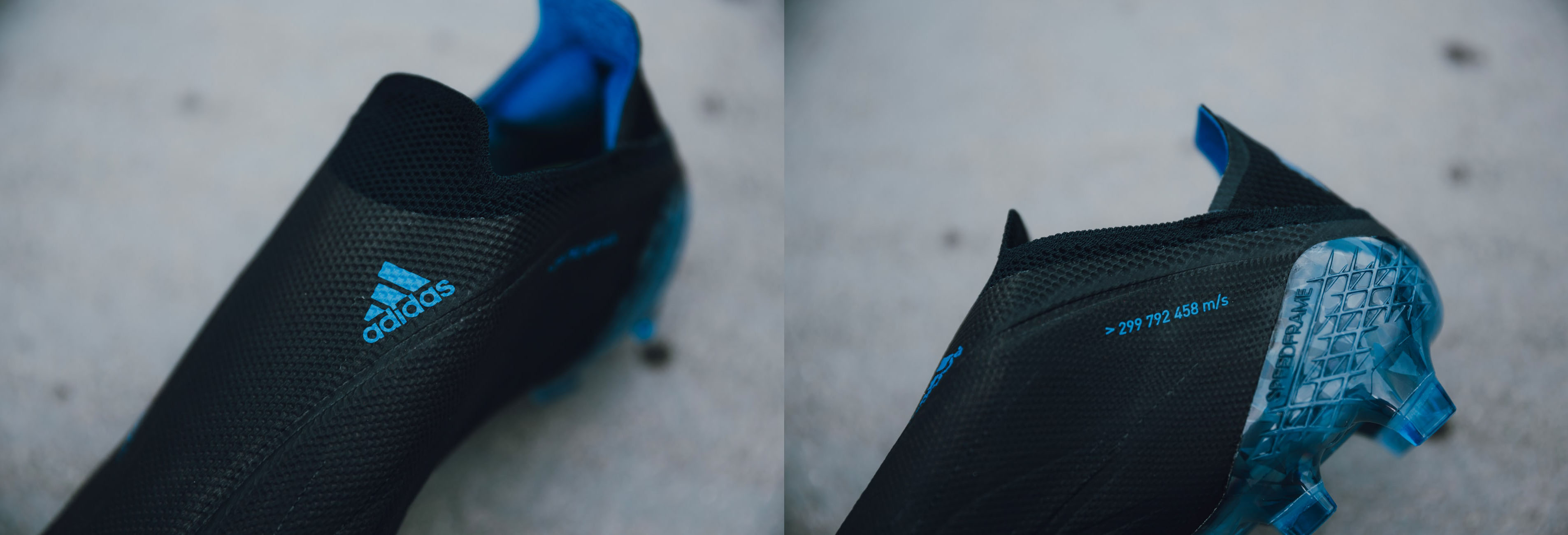 새로 출시된 엑스 스피드플로우의 경우 "Core Black / Sonic Ink / Solar Yellow" 색상이 사용되었는데요. 아디다스 축구화 중 가장 가벼운 Primeknit 어퍼의 질감을 잘 보여주는 것 같습니다. 발목 쪽에 파란색으로 표시된 숫자 "299792458 m/s"는 빛의 속도를 나타내며 엑스 스피드플로우의 디자인의 핵심을 볼 수 있습니다.