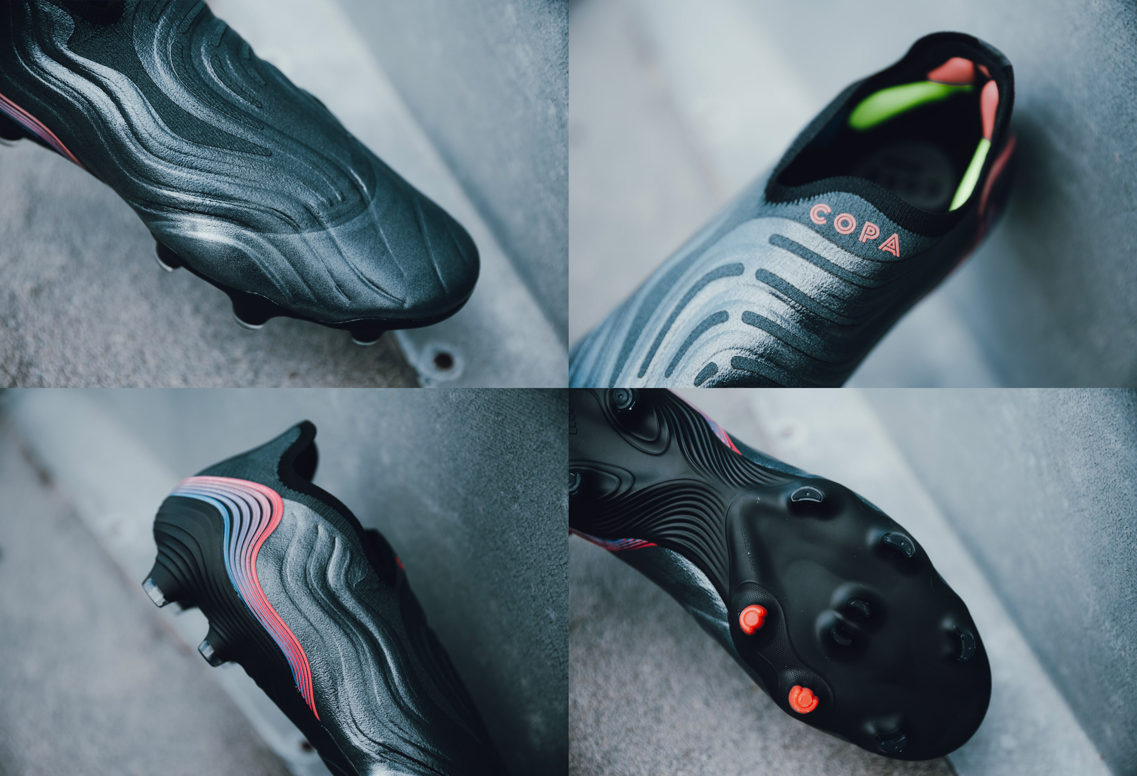 코파 센스는 반짝이는 금속 새조를 띠는 "Core Black/Dark Grey"가 사용되었습니다. 힐컵에는 파란색과 빨간색이 그라데이션 되어있고 스터드 및 'COPA' 문구에는 붉은계통의 색상이 포인트로 사용되었습니다. 금속 새조를 띄는 회색이 천연가죽이 주는 고급스러운 느낌을 한 층 올려주네요.
