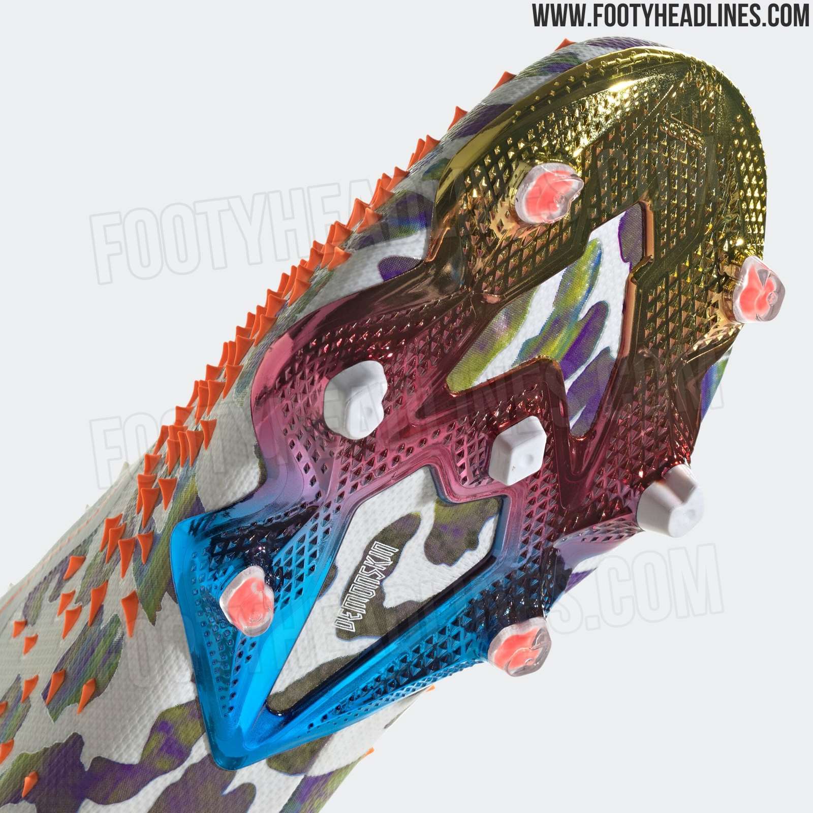 축구화의 아웃솔은 다채로운 색상으로 빛나는 크롬 코팅이 되어 있고, 뒤꿈치 부분에는 Stella McCartney가 세로로 새겨져 있습니다.