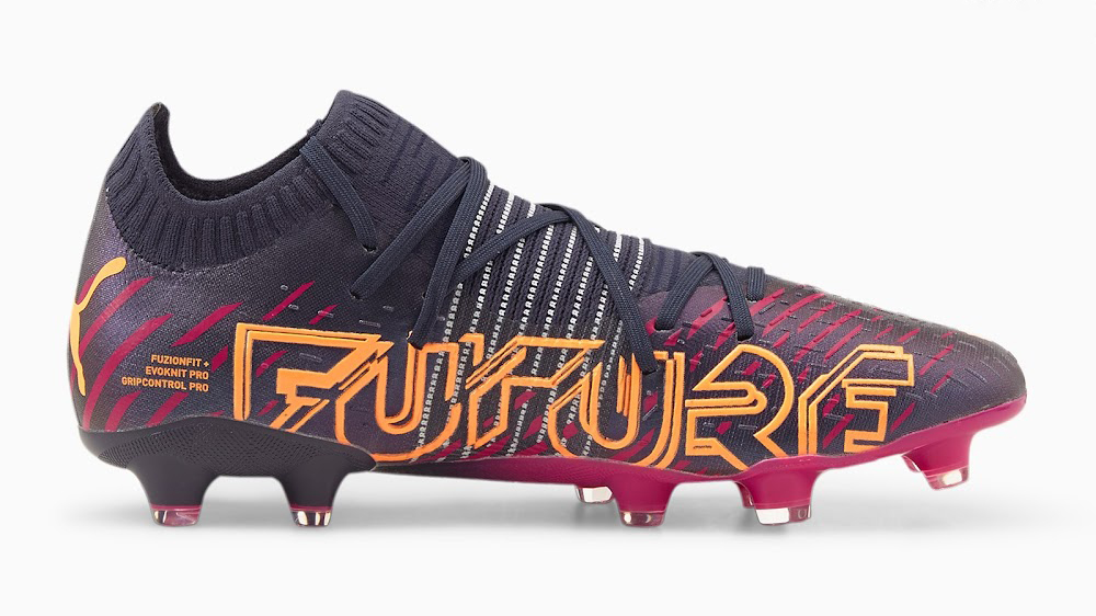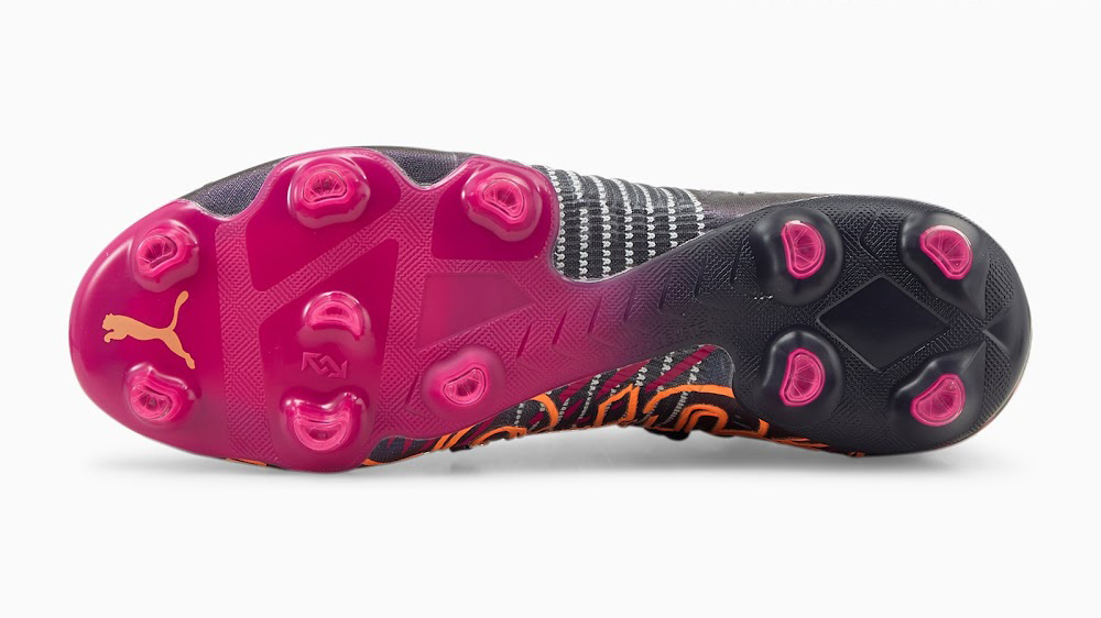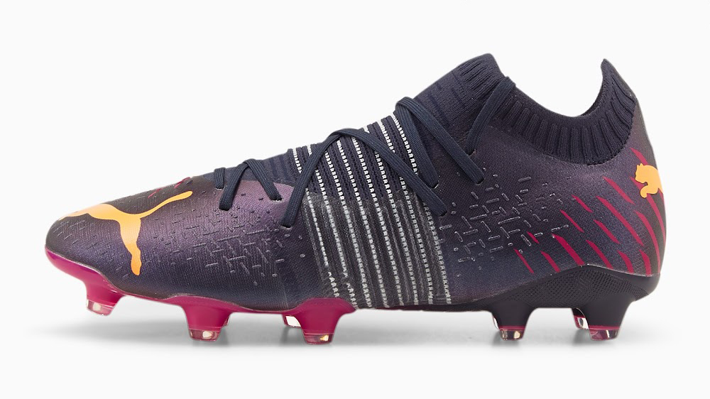 이번 축구화는 흥미로운 색상으로 과감한 디자인이 되어 있습니다. 새로운 푸마 퓨처 Z 1.2 '플레어 팩' 축구화는 반짝이는 보라색을 메인 컬러로 핑크빛 디테일과 조화를 이루고 있습니다.
