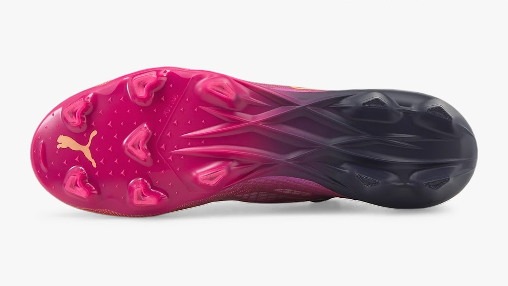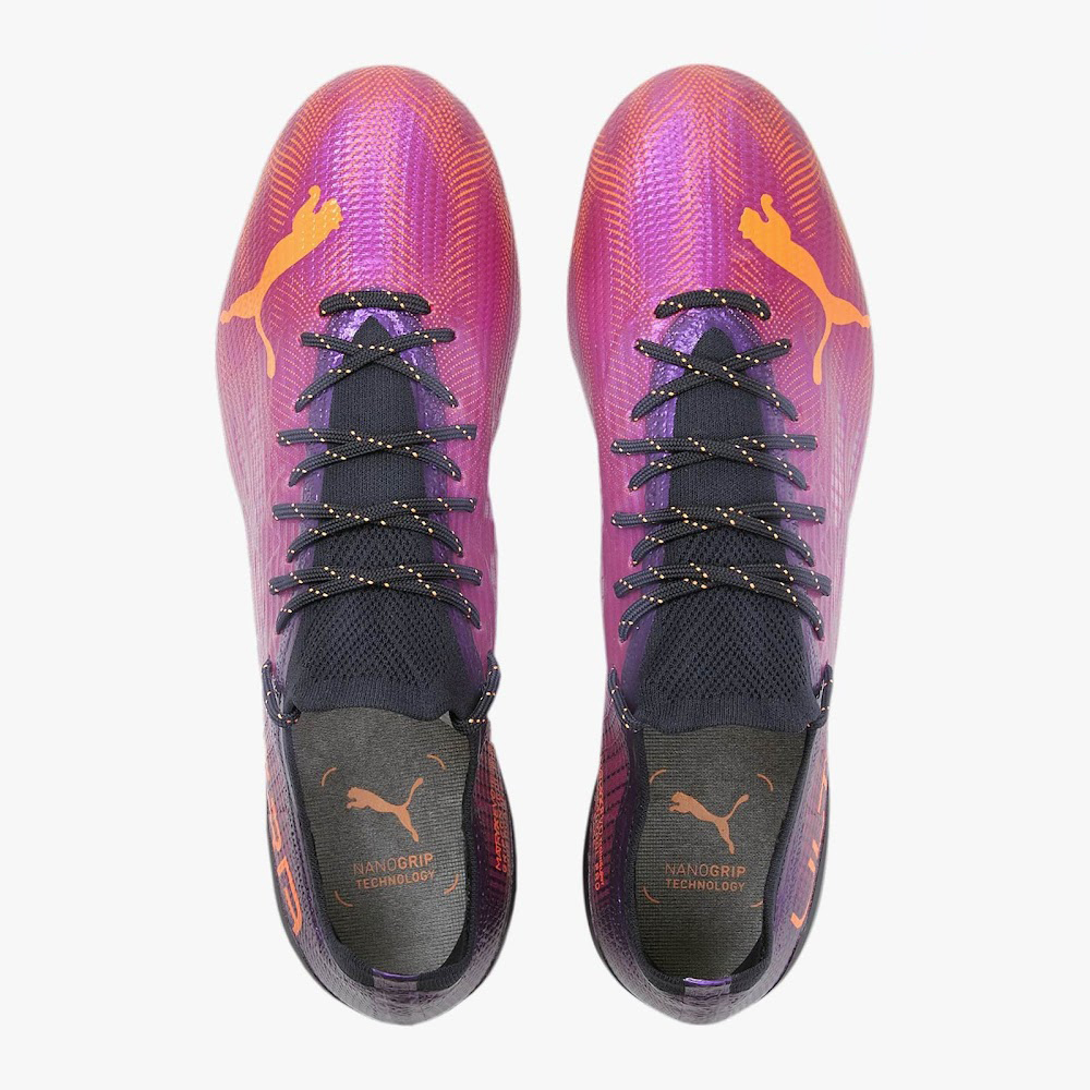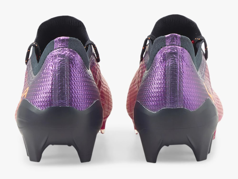 푸마 울트라 1.4 ‘플레어 팩’은 ‘Festival Fuchsia / Neon Citrus / Parisian Nights’의 공식 색상 조합으로 이루어져 있습니다. 첫 번째 울트라 1.4 축구화는 눈에 띄는 대담한 색상 조합을 갖고 있습니다. 보라색과 분홍색 어퍼에 주황색 푸마 로고와 ULTRA 글씨가 새겨져 있습니다.