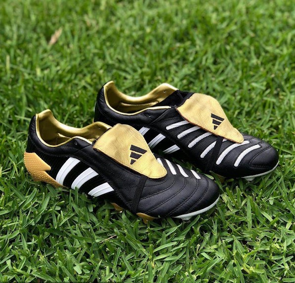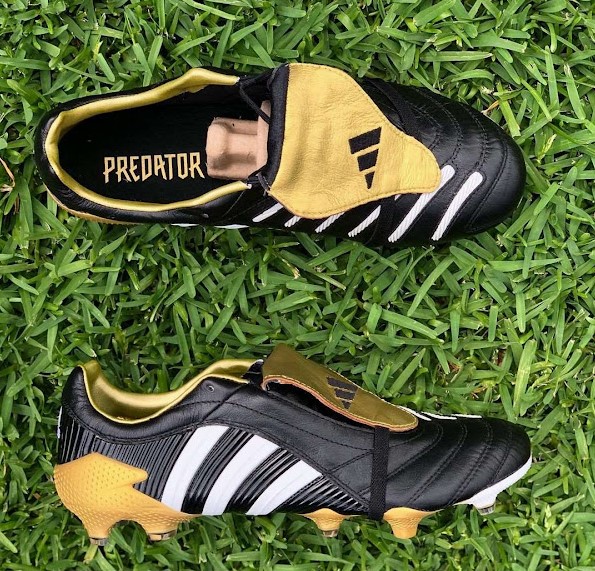 ‘프레데터 펄스 2021 레전드 팩’은 검은색 어퍼와 흰색 삼선 스트라이프, 황금색 텅, 아웃솔, 내부로 이루어져 있습니다.