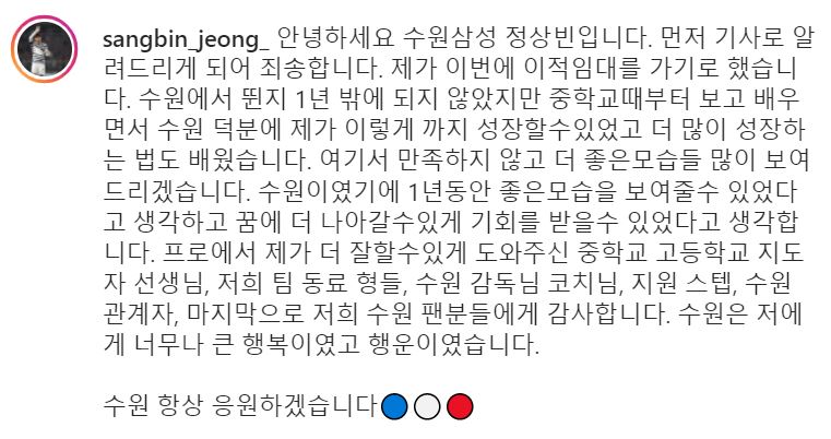 수원삼성축구단과 프리미어리그 울버햄튼은 정상빈 선수 이적에 최종 합의했고, 스위스로 출국한 정상빈 선수는 메디컬테스트를 완료하고 입단 절차에 돌입했다. 수원삼성은 시즌 개막을 얼마 남겨두지 않은 상황에서 갑작스러운 영입 제안에 난감한 상황이었지만, 선수의 미래와 도전을 존중하기 위해 대승적 차원에서 이적에 합의했다.