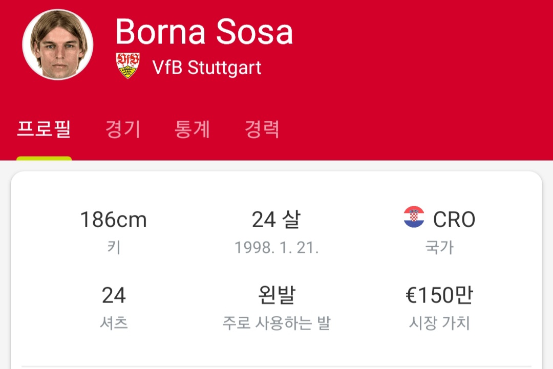 슈투트가르트 왼쪽 풀백 '보르나 소사' 98년생 키 186cm