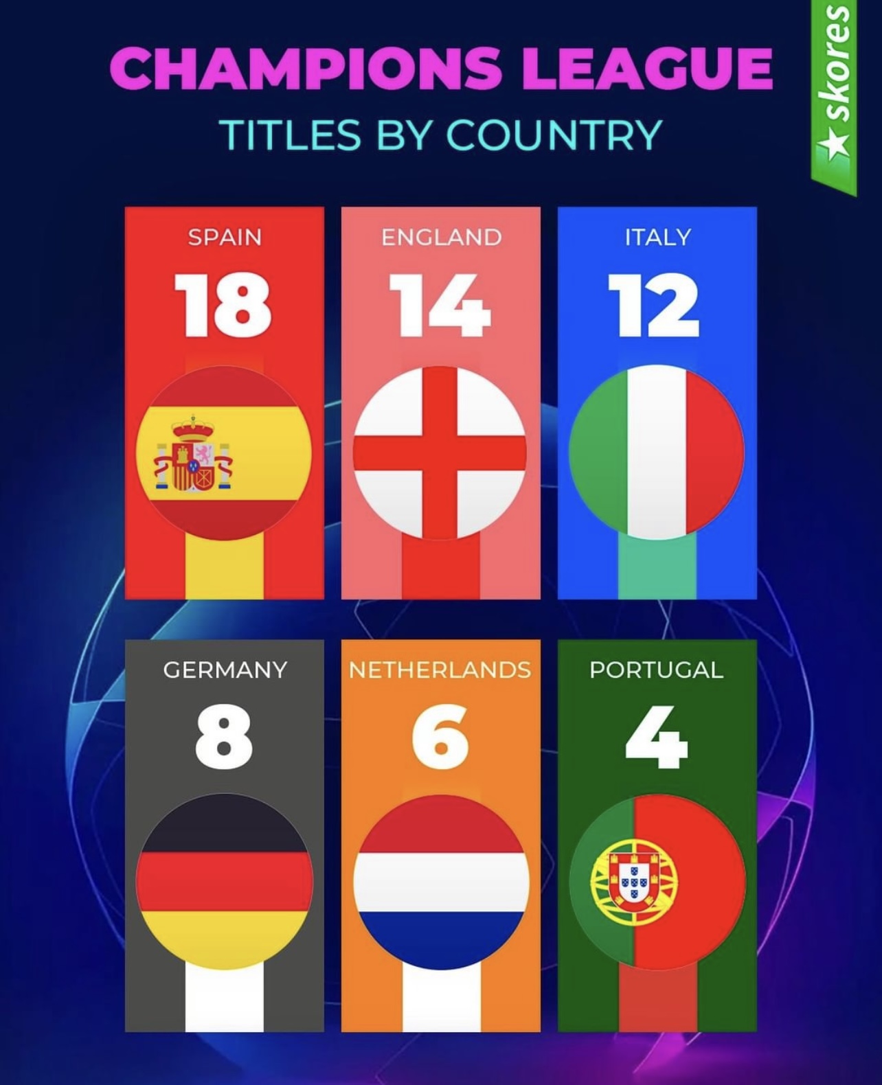 스페인 : 18개, 잉글랜드 : 14개, 이탈리아 : 12개, 독일 : 8개, 네덜란드 : 6개, 포르투갈 : 4개