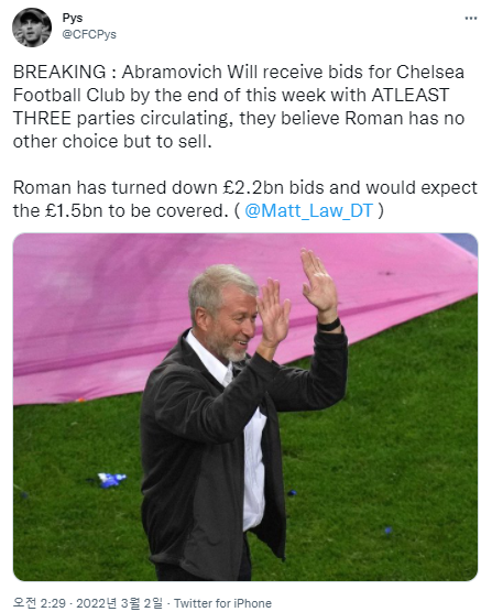로만 아브라모비치는 이번주말까지 첼시에 대한 입찰을 받을 것이고 최소 3명의 그룹이 관심있다는 소식이 있습니다. 그들은 로만이 첼시를 매각할 수 밖에 없다고 생각합니다. 로만은 22억 파운드의 입찰을 거절했고 빚 15억 파운드는 갚을것으로 예상됩니다.