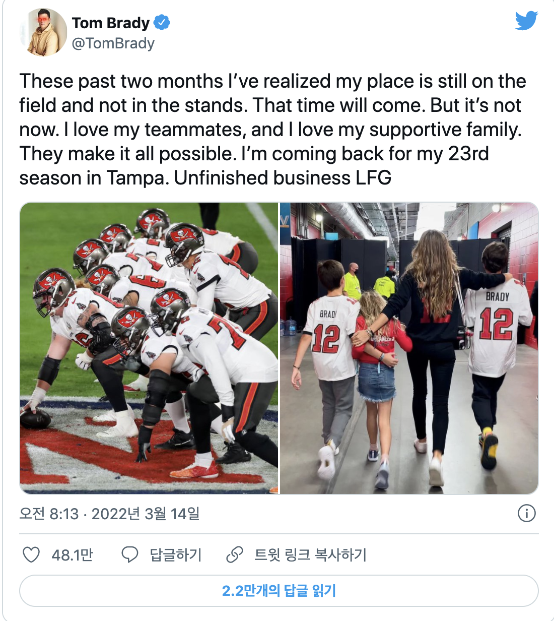 그리고 하루 뒤 결국 은퇴를 번복하고 다시한번 탬파에서 23번째 시즌을 위해 돌아온 NFL 역대 최고의 선수 '톰 브레디'ㄷㄷㄷㄷ