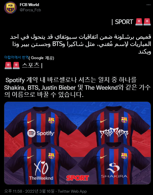 바르셀로나와 스폰서쉽 계약을 체결한 스포티파이. 양측의 협의에 따라 바르셀로나 유니폼 전면부는 다양한 아티스트들의 전시 공간이 될 것이라고 함. 스포티파이 로고 뿐만 아니라 아티스트의 새 앨범, 투어, 캠페인 소식 등을 새길 예정! BTS가 새겨지는 날이 올 수도??