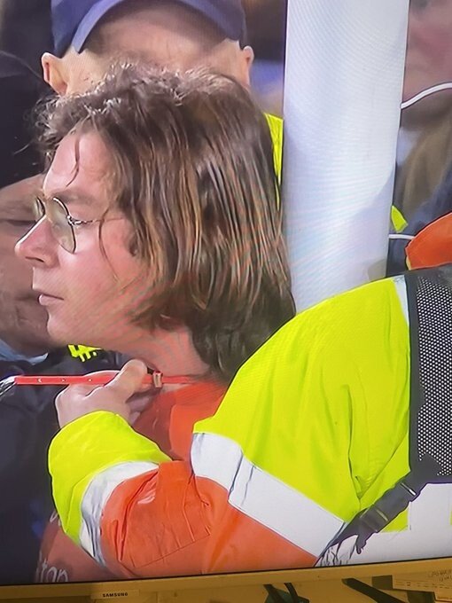 경기 도중에 관중 난입해서 케이블 타이로 자기 목을 스스로 골대에 묶음