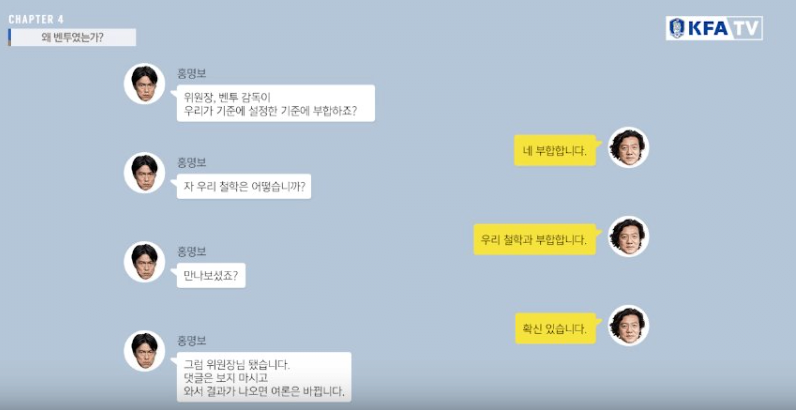 홍명보: 그럼 위원장님 됐습니다. 댓글은 보지 마시고 와서 결과가 나오면 여론은 바뀝니다. 벤투로 갑시다!