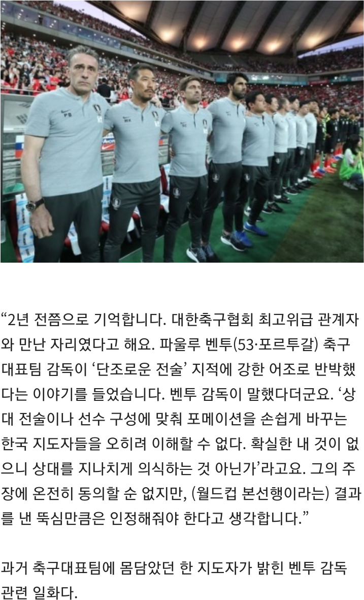 [벤투..." 상대따라 전술 바꾸는 한국 감독 이해 안간다"]