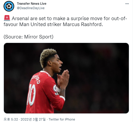 아스날은 맨유의 전력 외 선수로 분류된 마커스 래시포드 영입을 추진할 것이다.