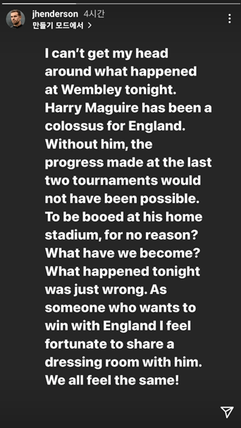 웸블리에서 국대 경기중 매과이어가 야유를 받은것에 대해 헨더슨이 인스타 통해 한마디 해준 상황인데. 진짜 잉글랜드의 참된 리더는 헨더슨인듯ㄷㄷㄷㄷ