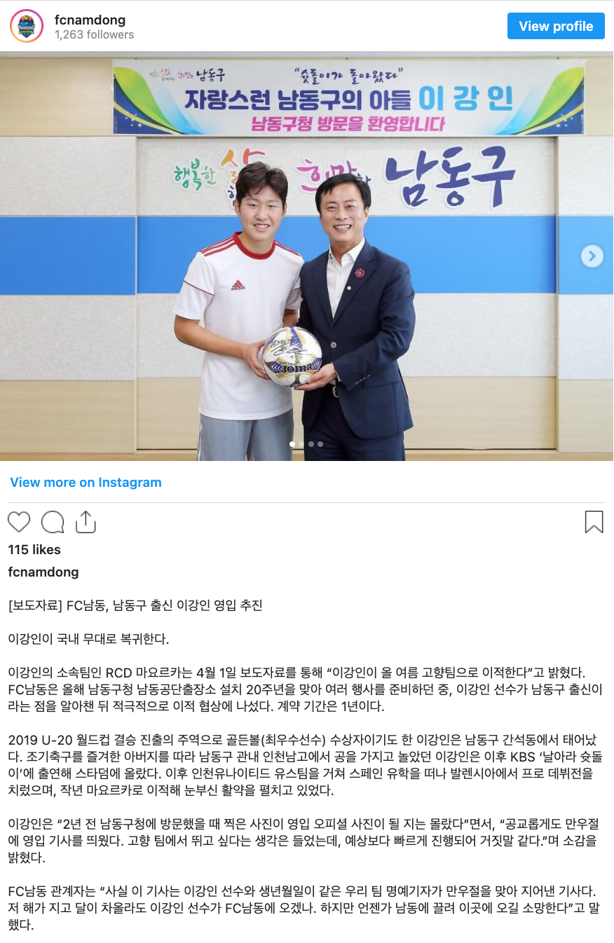 ['FC남동의 초대형 영입' 이강인의 고향팀 이적]