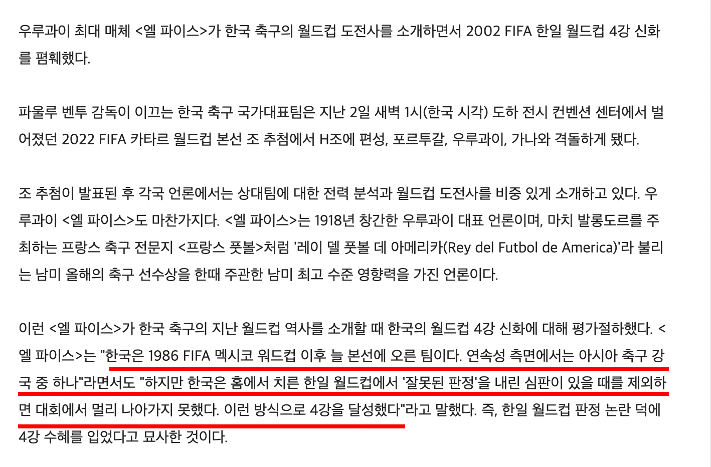 | "한국, 오심아니면 4강 못간다" 우루과이 최대 매체의 도발 | |