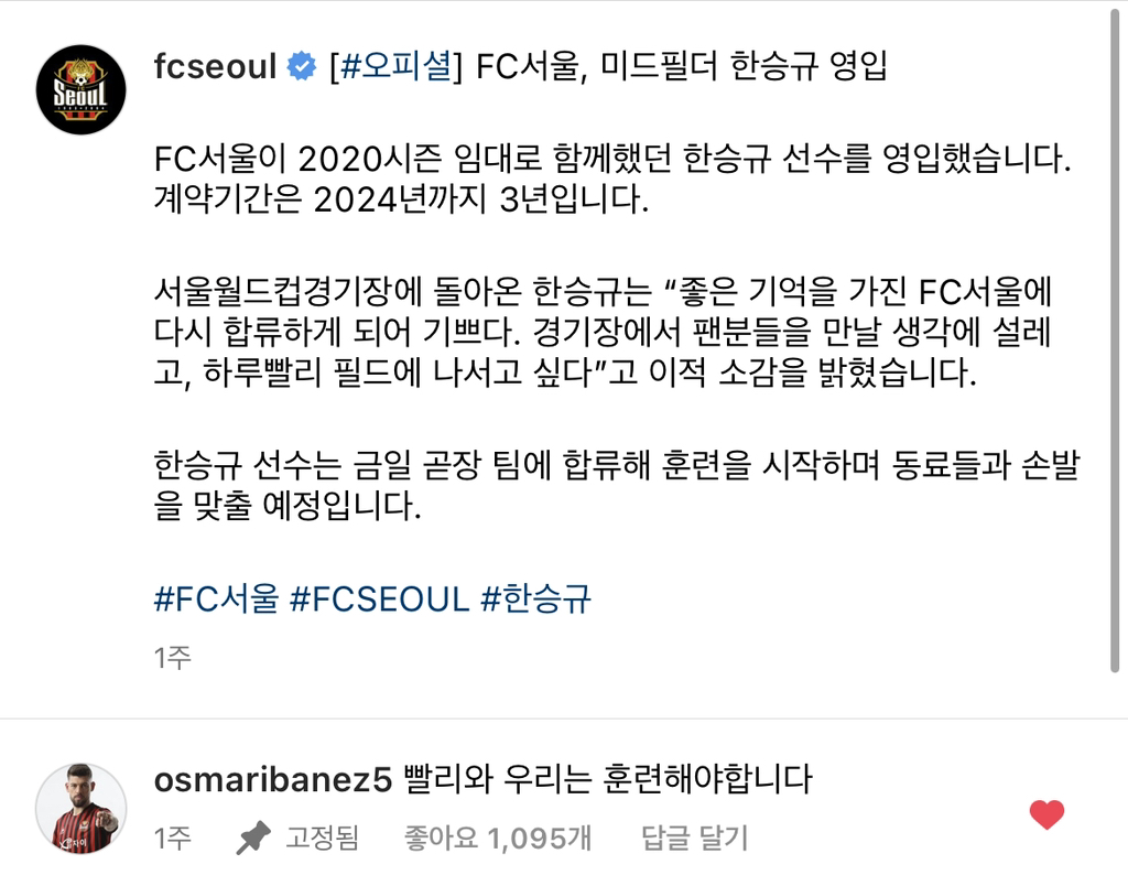 일주일 전 한승규의 영입 소식에 한글 완벽패치된 오스마르의 댓글ㅋㅋㅋㅋㅋㅋ그리고...