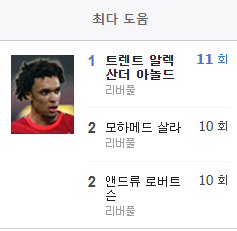 21/22 시즌 현재 도움 1위는 아놀드ㄷㄷㄷ 리버풀이 1,2,3위 기록중ㄷㄷㄷㄷ