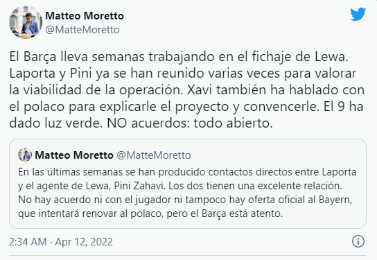 [마테오 모레토-공신력 상] 바르샤는 지난 몇 주 동안 레반도프스키를 영입하기 위해 노력하고 있다. 라포르타와 피니는 이미 여러번 만나 이적 실행 가능성을 평가했다. 사비는 레반도프스키에게 프로젝트를 설명하며 설득했고, 레반도프스키는 청신호를 보냈다. 계약은 아직 없고, 모든 가능성을 열려 있다.