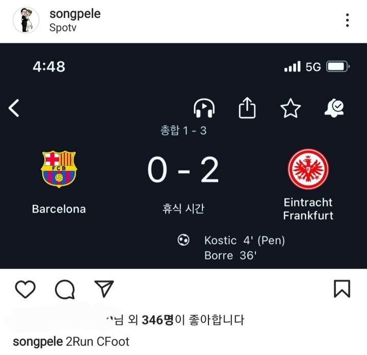 바르셀로나 전반종료 후 송영주 해설위원의 인스타그램