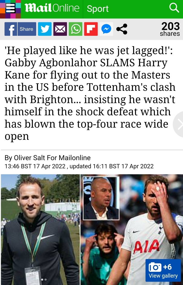 아그본라허 - "나는 해리 케인의 빅팬이다. 하지만 마스터즈(골프) 경기를 보러 미국에 갔다온 후에 이런 경기력을 보인다면 질문을 해야한다. 이게 옳은 행동이였는가?? 케인은 브라이튼전에서 시차적응으로 고생하는것처럼 보였다. 토트넘은 톱4 경쟁에서 맨유, 아스날에 앞서 있을 때마다 스스로 그 기회를 날려버린다."