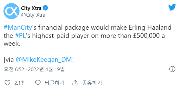 홀란드 측과 합의 완료한 홀란드, 주급 50만 파운드 이상(약 8억)으로 PL 역사상 최고의 주급자가 될 것.