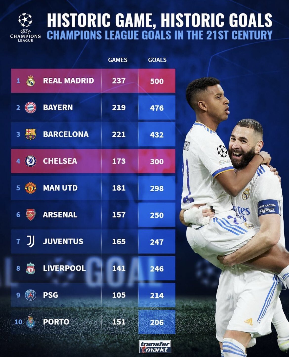 ['챔스 최강클럽은 어디?' 21세기 챔스 팀 득점 순위]