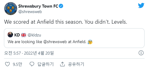 슈루즈버리 공식계정 : 응~ 우린 올시즌 안필드에서 골 넣었고, 너넨 못 넣음.